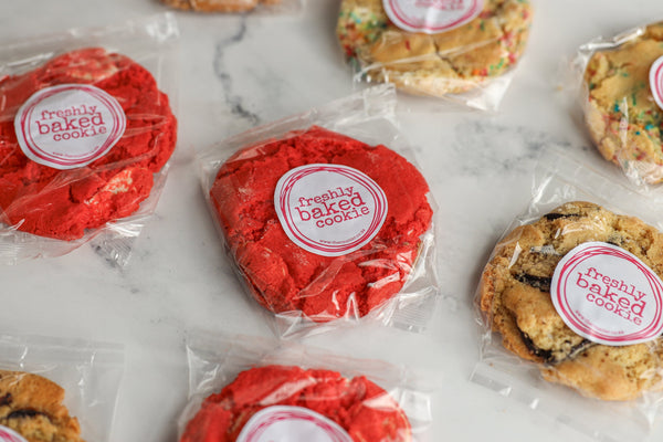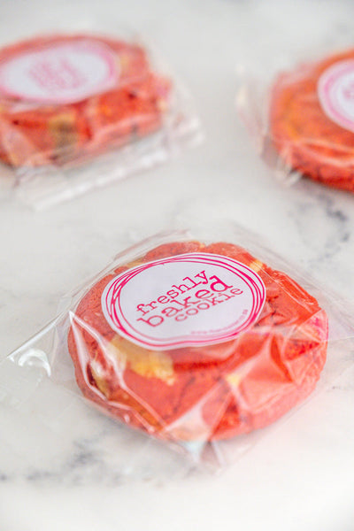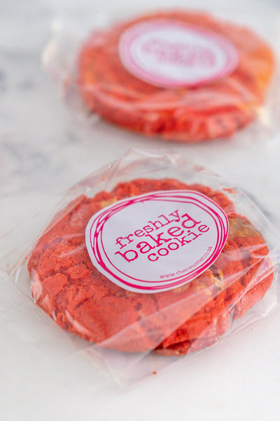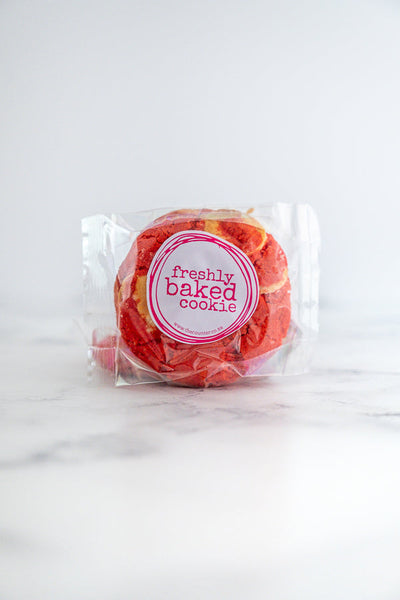 Red Velvet cookie with couverture white chocolate drops. (70g) Excess stock - sell by date is middle of September, but they are still fine to eat.