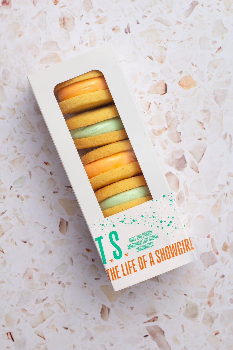 These Marshmallow Cookie Sandwiches are made up of a sweet sugar cookie, topped with a dollop of chocolate (white chocolate on the mint cookie, dark chocolate and the orange cookie) and filled with mint and orange marshmallow. Packaged in a sweet little box and finished with a TS branded sticker - this is the perfect little gift for a Swiftie!